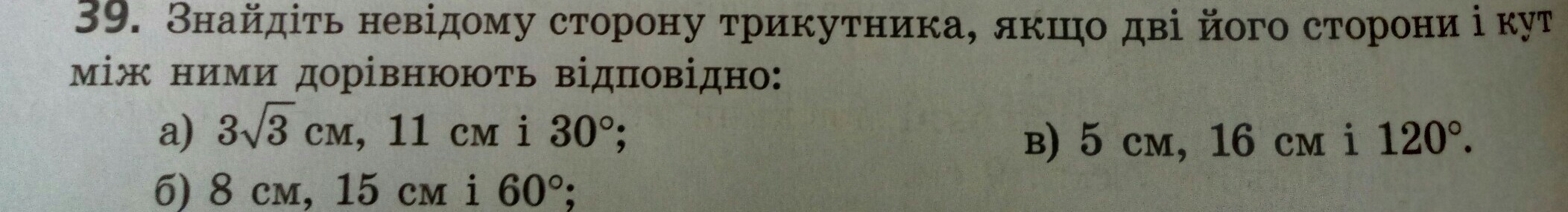 все эти задачи решаются по теореме косинусов любая сторона треугольника в квадрате равна сумме квыадратов двух других его сторон минус удвоенное произведение двух других сторон на комсинус угла между ними. а²= 27+121-2*3√3*11*√3/2=49см² а=7см