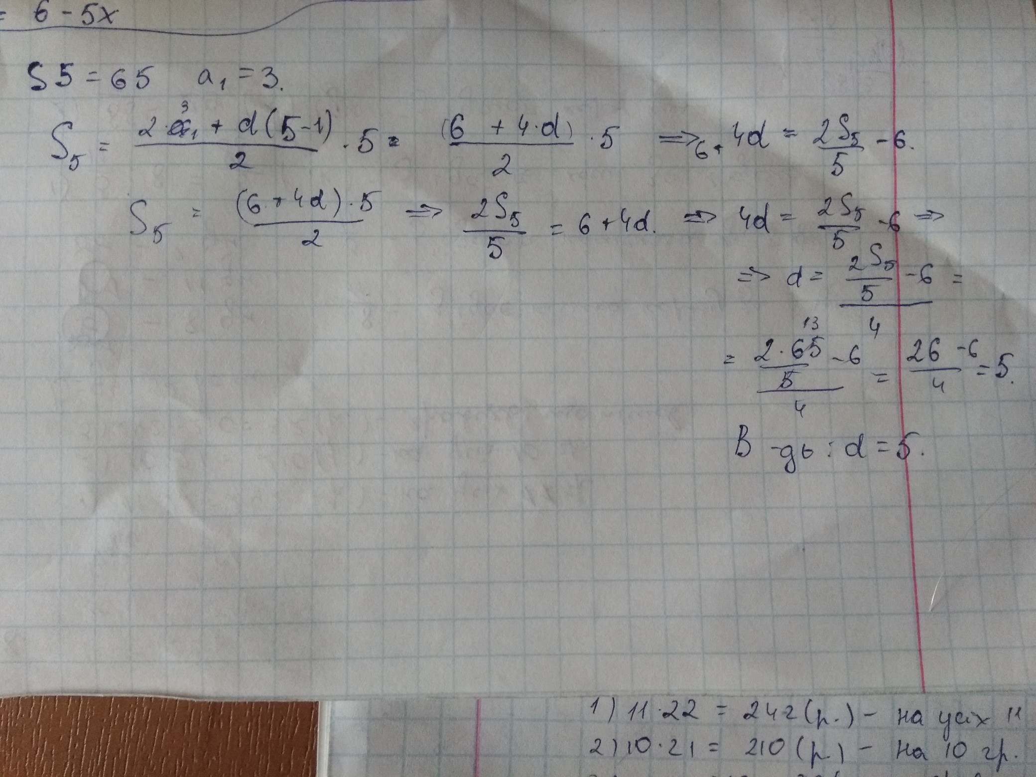 отсюда - d=(((2*S5)/5)-6)/4=(((2*65)/5)-6)/4=(26-6)/4=5