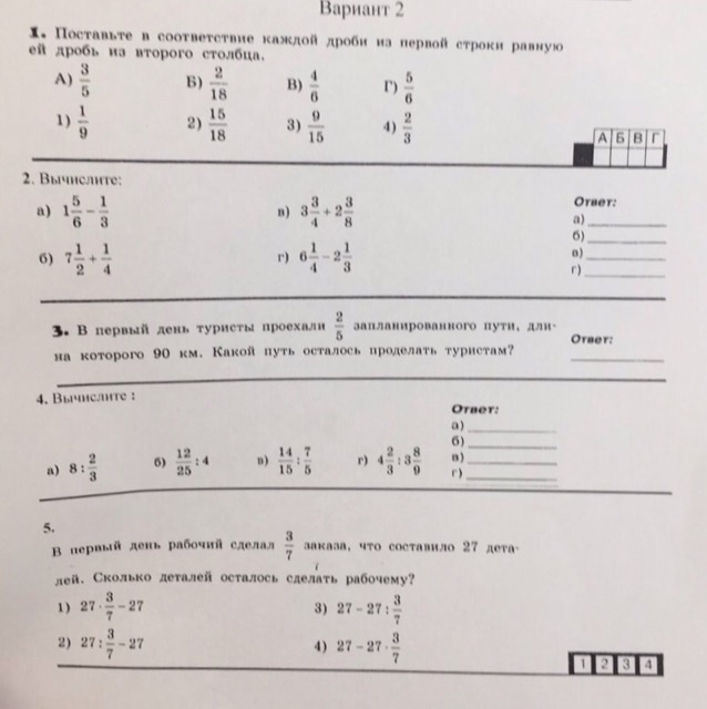 1. А3, Б1 , В 4 , Г2 2. а) 1 5/6-1/3= 11/6-1/3=11/6-2/6= 9/6= 1 3/6= 1 1/2= 1,5 б)7 1/2+1/4= 15/2+1/4=30/4+1/4= 31/4= 7 3/4=7,75 в)3 3/4+2 3/8= 15/4+19/8=30/8+19/8=49/8=6 1/8 г)6 1/4- 2 1/3= 25/4-7/3=75/12-28/12= 47/12=3 11/12 дальше не знаю