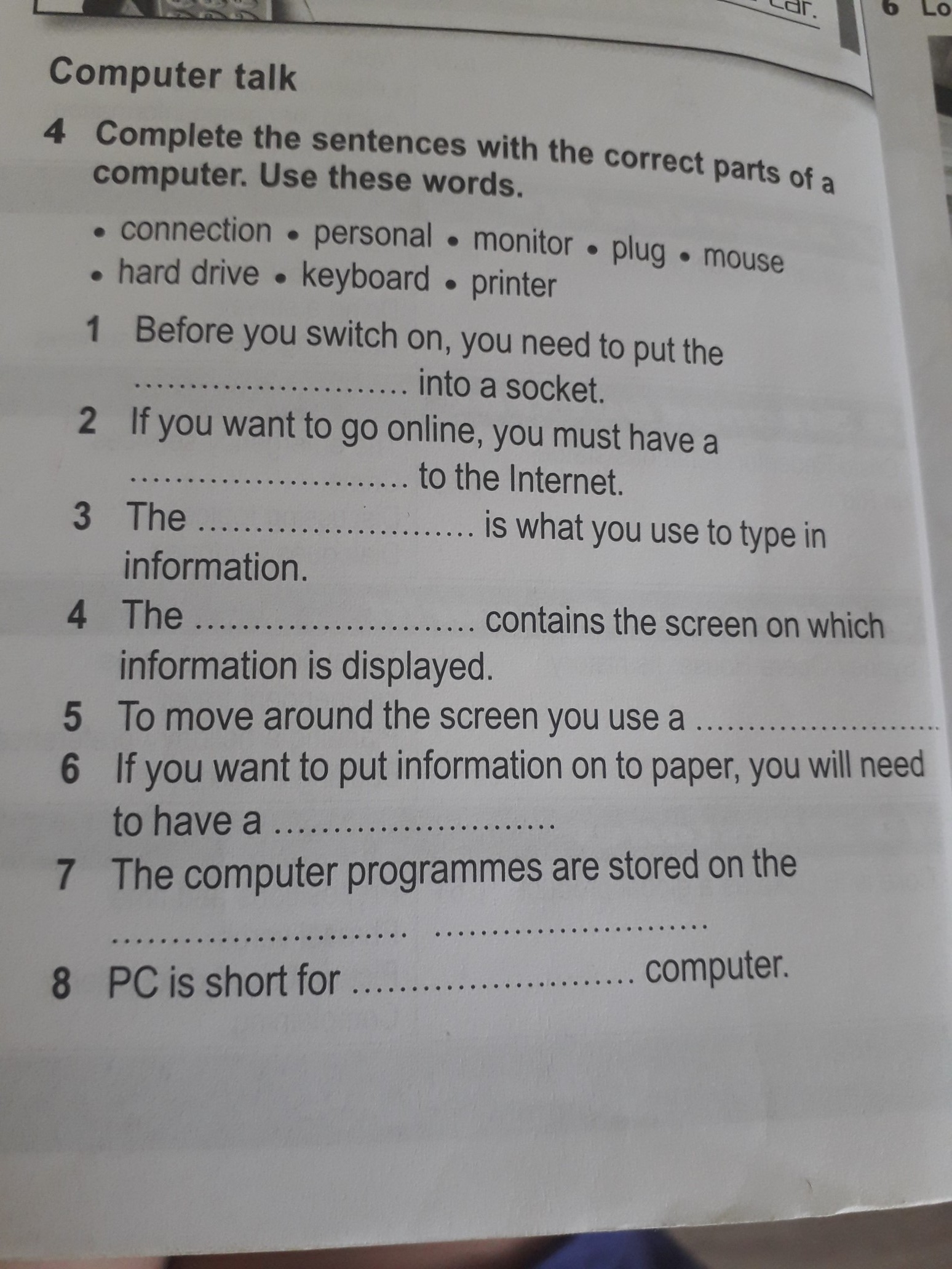 1 plug 2 connection 3 keyboard 4 monitor 5 mouse 6 printer 7 hard drive 8 personal