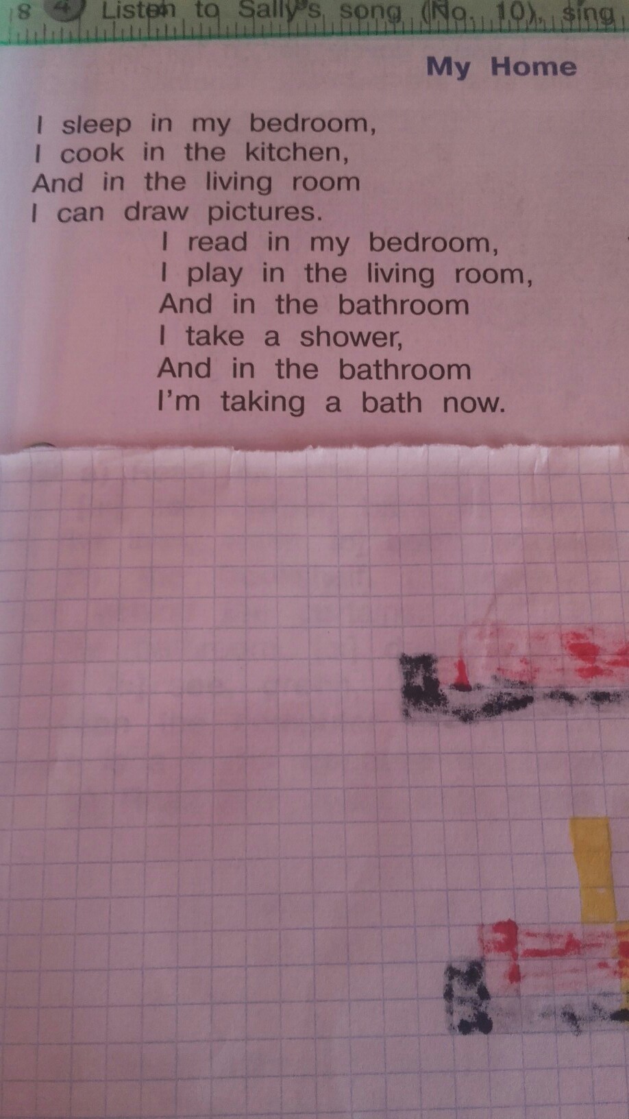 Ай слип ин май бэдрум, Ай кук ин зе китчен, Энд ин зе ливинг рум. Ай кэн драу пикчюрес. Ай рид ин май бэдрум, Ай плэй ин зе ливинд рум, Энд ин зе батхрум Ай эм тэкинг э батх нау.