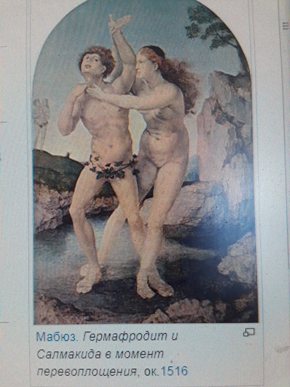 3) во время странствий по Карии в возрасте 15 лет его увидела нимфа Салмакида и влюбилась в него. Когда он купался в источнике в котором жила эта нимфа, она прильнула к нему и попросила богов навеки соединить их. Он влюбился в нее, и они слились в одно двуполое существо, по преданию каждого кто пил из этого источника достигала судьба гермафродита.
