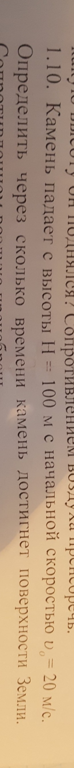 камень падает с высоты h равной 100 м с начальной скоростью 20 м/с .Определите Через сколько времени камень достигнет поверхности земли сопротивлением воздуха пренебречь.