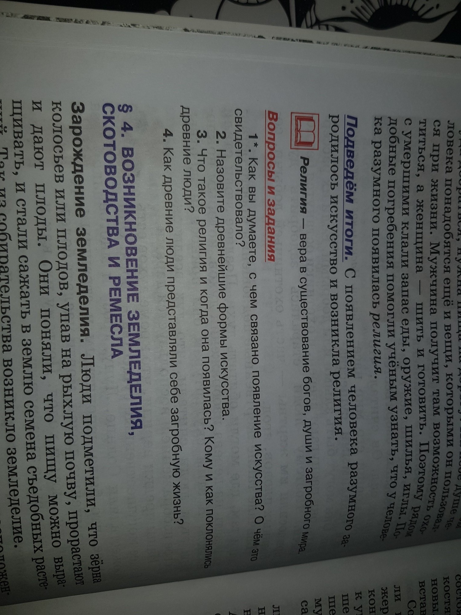 3) Зарождение у людей веры в духов и богов. У человека разумного зародилась вера в существование сверхъестественных сил. Он считал, что окружающий его мир населён невидимыми существами. Они могут быть злыми или добрыми. Если их рассердить, они распугают зверей, и охотники останутся без добычи. Поэтому люди старались задобрить духов, приносили им жертвы — часть охотничьей добычи, собранных плодов, ягод. Вначале такие жертвенные подношения просто оставляли там, где могли обитать духи. Позднее люди стали вырезать из дерева изображения духов, которым поклонялись. К этим скульптурам они приносили жертвы. При этом люди считали, что дух вселится в своё изображение и воспользуется дарами. Наши предки верили, что кроме духов есть более могущественные существа — боги. Они обожествляли Солнце, Луну, грозу и многое другое, что было непонятным и страшным. Боги, по мнению людей, могли наслать болезни, засуху, лютый холод. Поэтому их, как и духов, надо было задабривать.