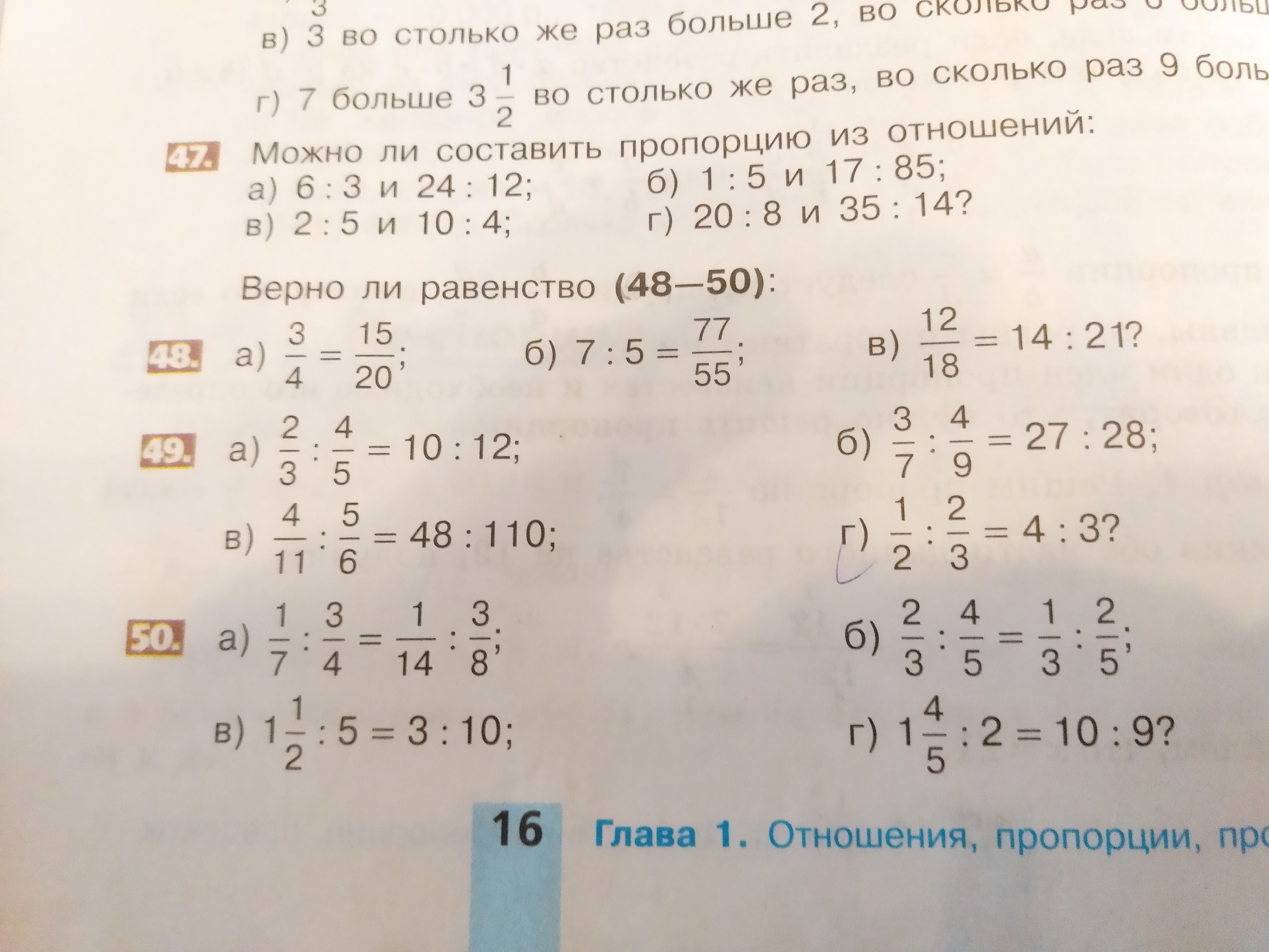 48) А)3*20=15*4 60=60 верно Б) 5*77=7*55 385=385 верно В) 18*14=12*21 252=252 верно 50) А)1/7*3/8=3/4*1/14 3/56=3/56 верно Б) 2/3*2/5=4/5*1/3 4/15=4/15 верно В) 5*3=10*1 1/2 5*3=10*1,5 15=15 верно Г) 2*10=9*1 4/5 2*10=9*1,8 20 больше 16,2 неверно