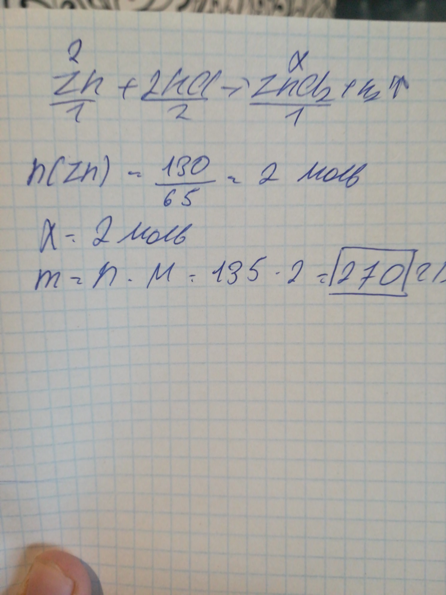 Найти массу соли ZnCl2 полученную при взаимодействии 130 гр цинка (Zn) с соляной кислотой HCl.