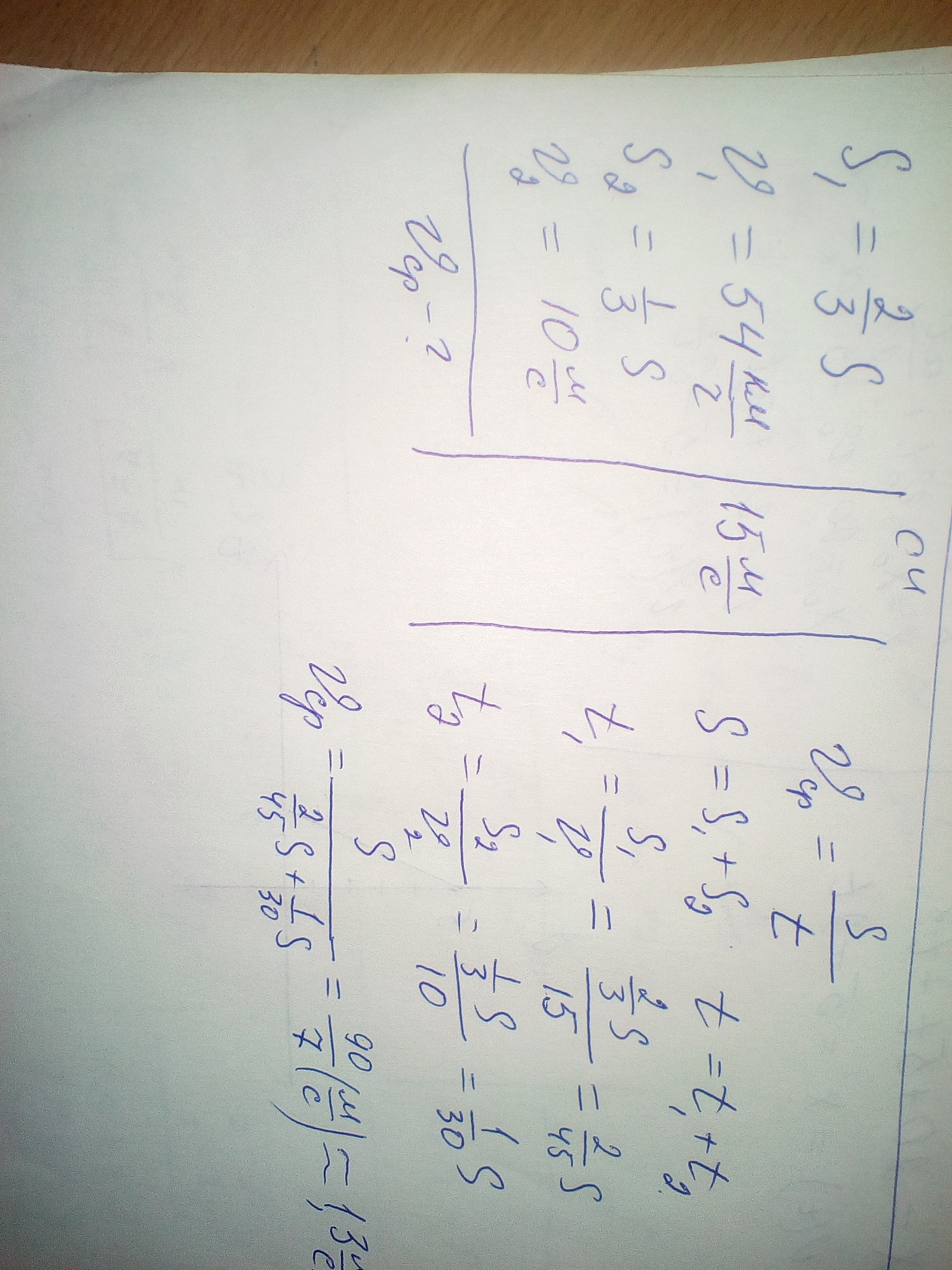 t1=s1/v1=2/3s/15=2/45s t2=s2/v2=1/3s/10=1/30s Vср=S/T=S/2/(2/45s+1/30s)=90/7=1,3м/с
