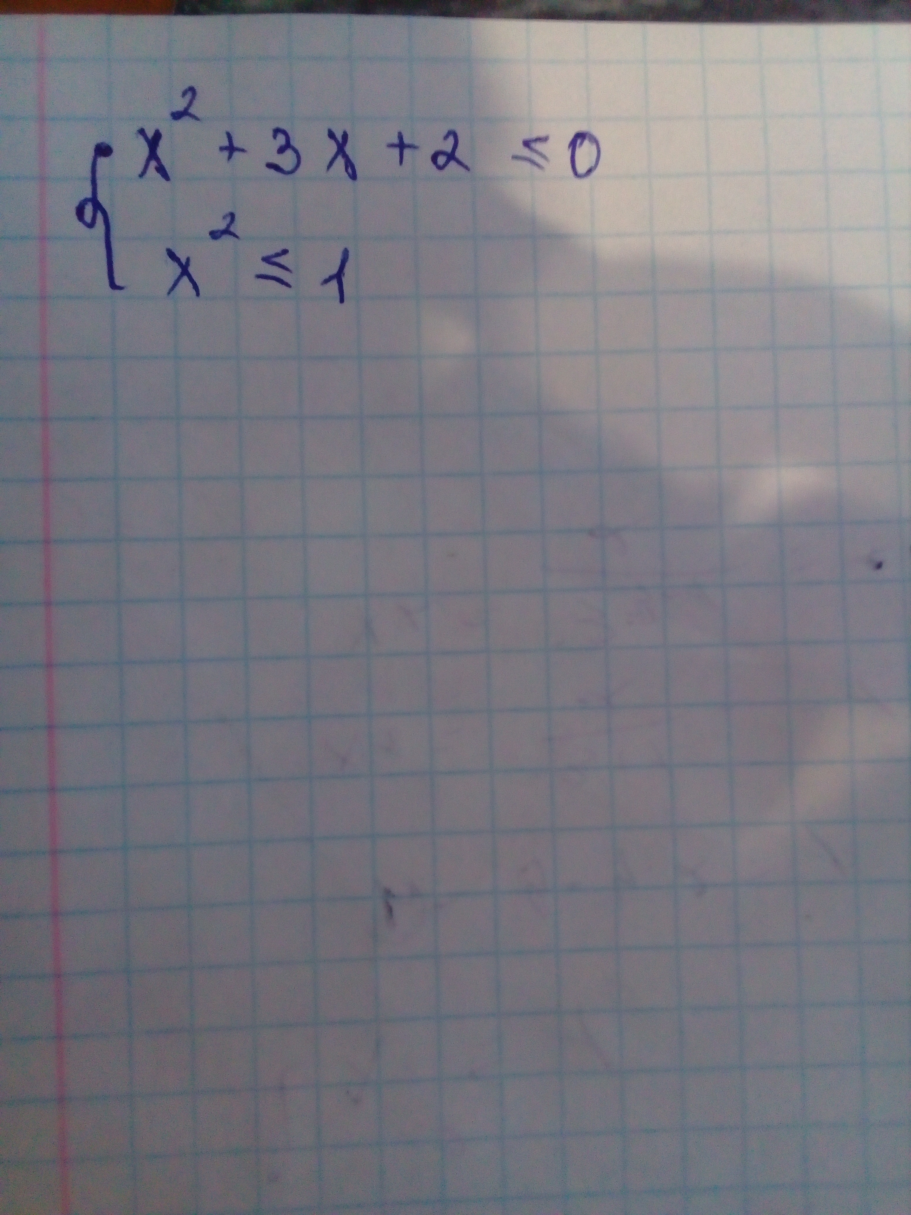 a); ; x^2+3x+2leq 0; ,; ; ; x_1=-1; ,; x_2=-2; ; (teorema; Vieta)\\znaki; (x^2+3x+2):; ; ; +++[-1, ]---[-2, ]+++\\xin [-1,-2, ]\\b); ; x^2leq 1; ; to ; ; x^2-1leq 0\\(x-1)(x+1)leq 0; ; Rightarrow ; ; x_1=-1; ,; x_2=1\\znaki; (x-1)(x+1):; ; ; +++[-1, ]---[, 1, ]+++\\xin [-1,1, ]\\c); ; left { {{yx^}+3x+2leq 0 atop {x^2leq 1}} right. ; left { {{xin [-1.-2, ]} atop {xin [-1,1, ]}} right. ; ; Rightarrow ; ; xin [-1,1, ]; -; otvet