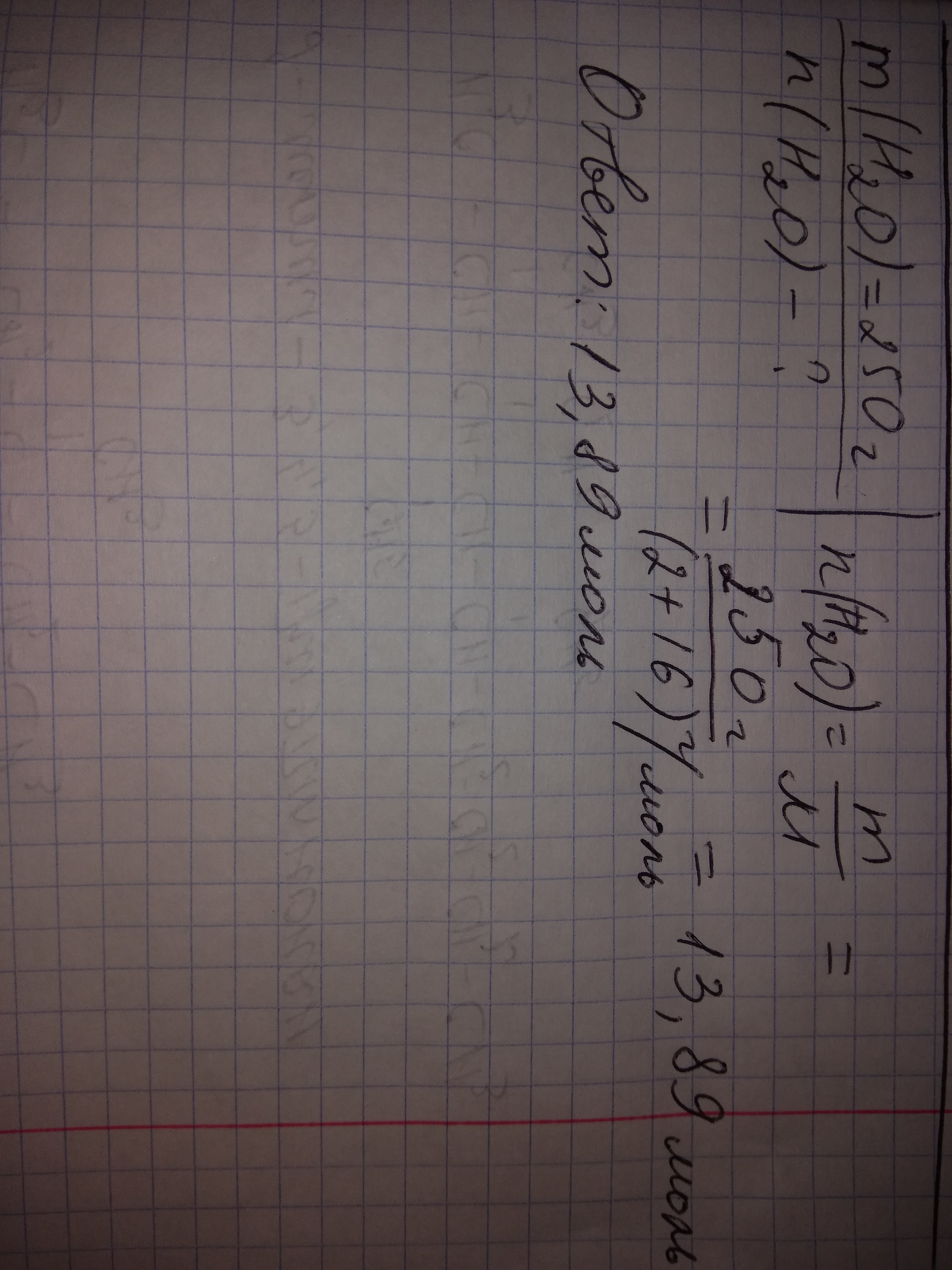 Обычный столовый стакан вмещает 250 г воды. Расчитайте химическое кол-во воды которое содержится в полностью заполненном водой стакане! Срочно!!!