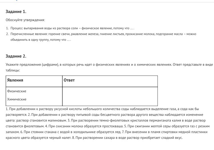 Задание 1 1. Потому что изменяется агрегатное состояние вещ-ва. 2. Т.к. всё это химические явления, тоесть изменяются запах, цвет, консистенция вещ-ва. Задание 2 По аналогии с первым, т.е. смотри: Физические явление - это измение агрегатного состояния вещ-ва (жидкое, твёрдое, газообразное), его формы, но состав тела не изменяется. Химическое явление - всегда получение нового вещ-ва (по типу ржавчины, кефира, творога и т.п)