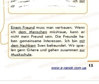 Другу нужно доверять. Если я не доверяю человеку, то он не может быть моим другом. Друзья имеют общие интересы. Я дружу с соседом Свеном. Мы охотно играем на гитаре и ходим вместе в музыкальную школу.
