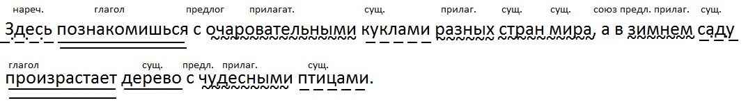 Сделай синтаксический разбор предложения: Здесь познакомишься с очаровательными куклами разных стран мира, а в зимнем саду произрастает дерево с чудесными птицами.