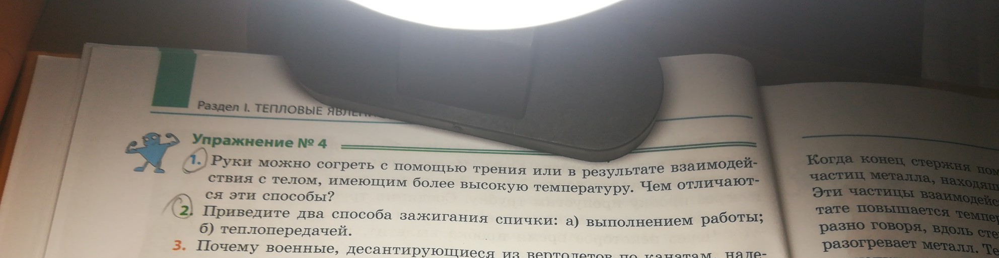 1. Согревание рук при помощи трения – это способ изменения внутренней энергии за счет совершения руками определенной работы. При взаимодействии рук с телом, имеющим более высокую температуру, происходит изменение внутренней энергии за счет теплопередачи.
