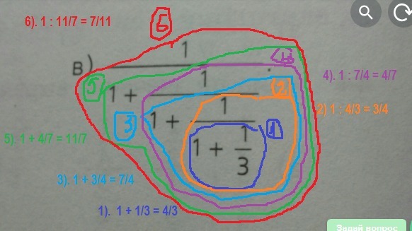 Самая большая дробная черта - последнее действие, а начинать надо с самой маленькой черты - именно с этой дробью (1/3) первое действие. Единицу всегда можно представить в виде дроби с числителем, равным знаменателю, причем знаменатель можно выбрать любой, нужный нам.