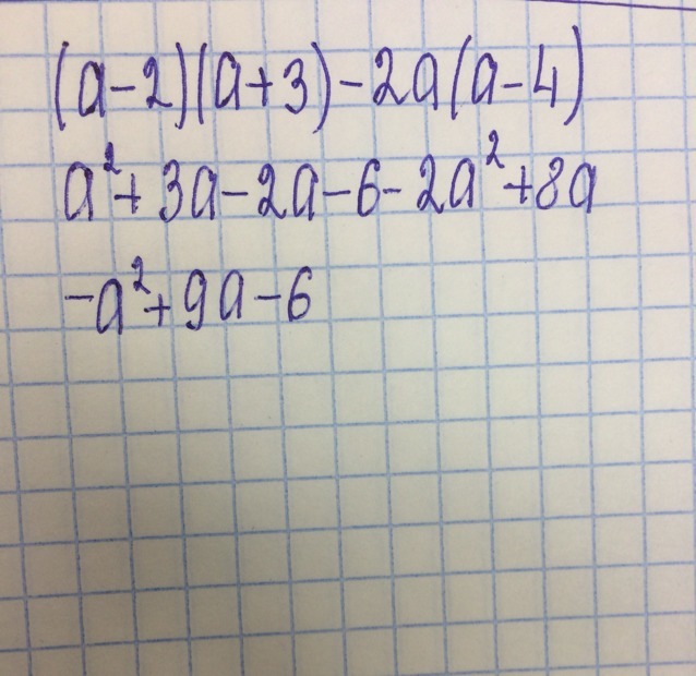 a^2+3a-2a-6-2a^2+8a= -a^2+9a-6. Ответ: -a^2+9a-6. ^- это степень.