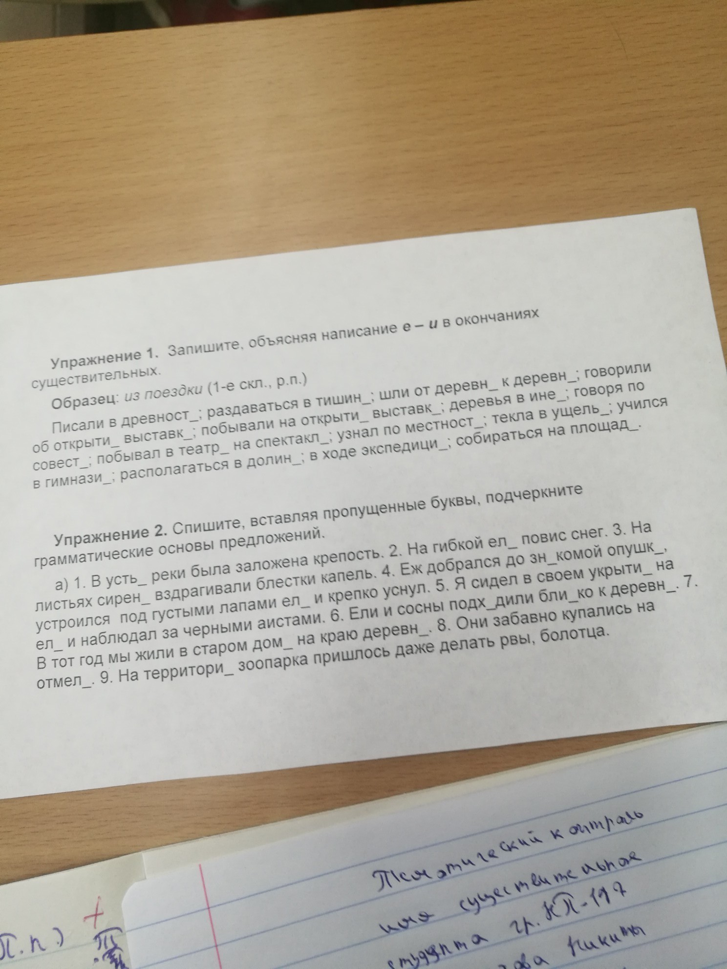 Упражнение 2. 1 устье 2 ели 3 сирени 4 знакомой опушки 5 укрытии на ели 6 подходили близко к деревне 7 доме; деревни 8 отмели 9 территории
