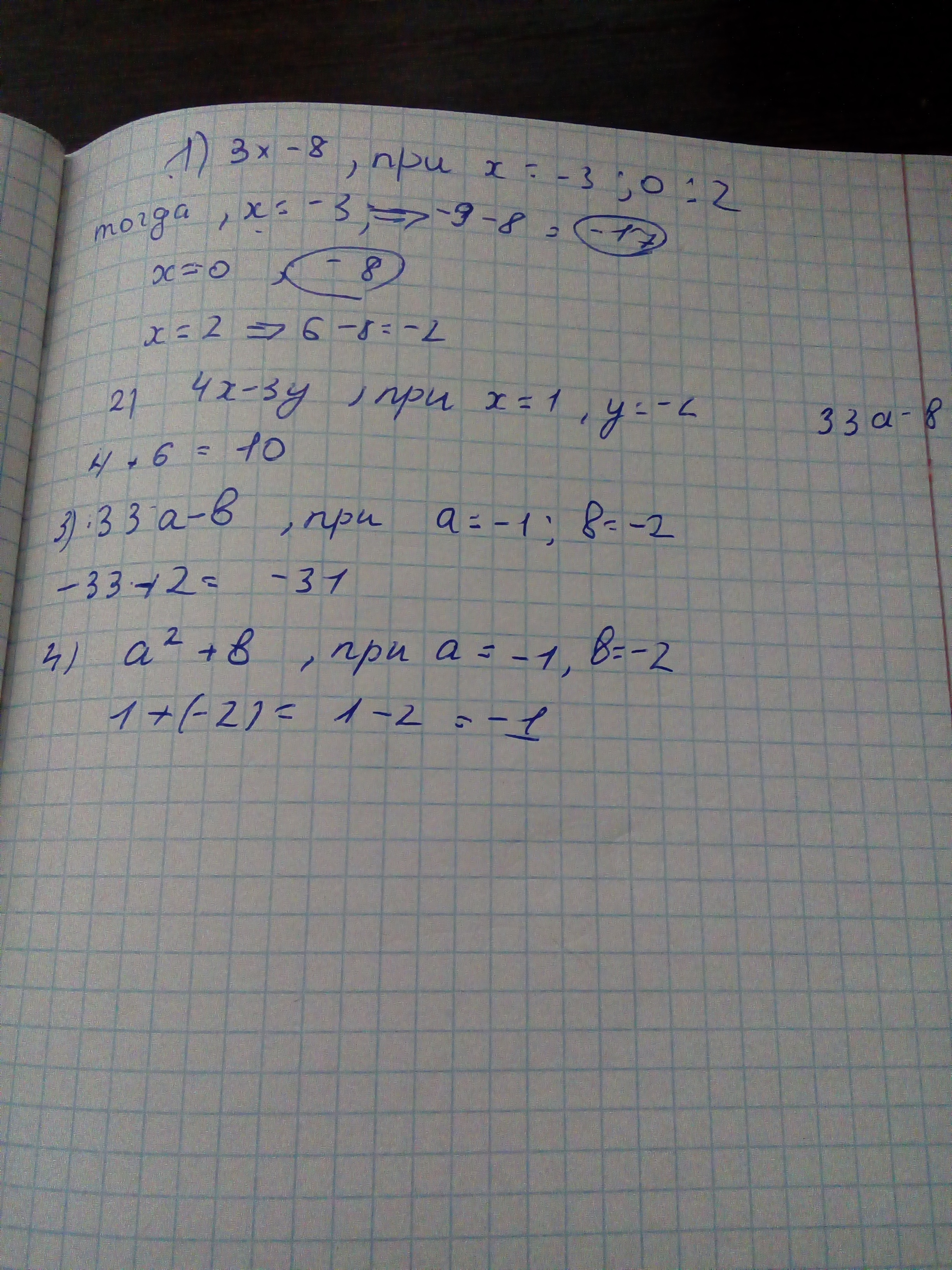 найдите значение выражения 1)3x -8 при x= -3;0;2