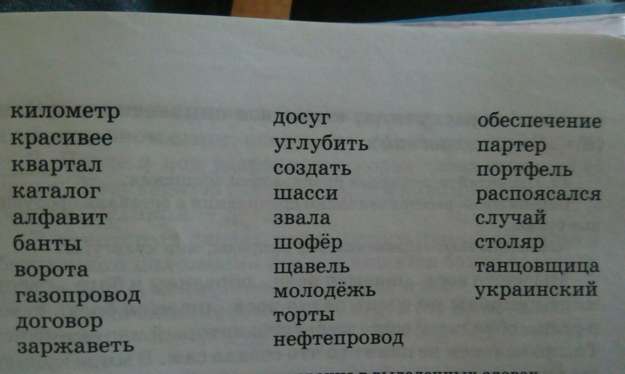 каталог ударение на о, алфавит ударение на и, банты на ы, ворота на вторую о, газопровод на третью о, договор на третью о, заржаветь на е,досуг на у, углубить на и, создать на а, шасси на и, звала на вторую а, шофер на е, щавель на е, молодежь на е, торты на ы, нефтепровод на вторую о,обеспечение на третью е,партер на е, портфель на е, распоясался на первую я,случай на у, столяр на я, танцовщица на о, украинский на первую и