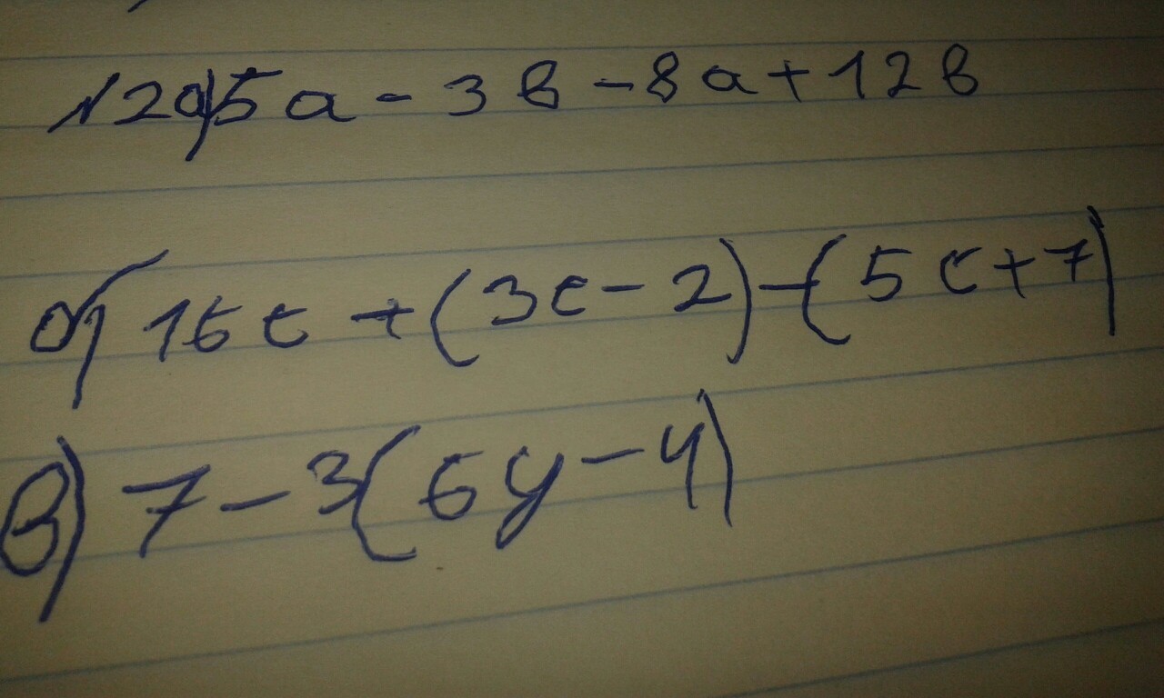 1)5a-3b-8a+12b=-3a+9b\ 2)16c+(3c-2)-(5c+7)=16c+3c-2-5c-7=14c-9\ 3)7-3(6y-4)=7-18y+12=19-18y
