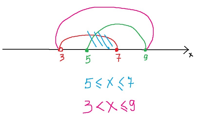 Помогите пожалуйста решить Найди пересечение и Объединение множеств решений двух неравенств 3 <×<=7 5 <=×<=9