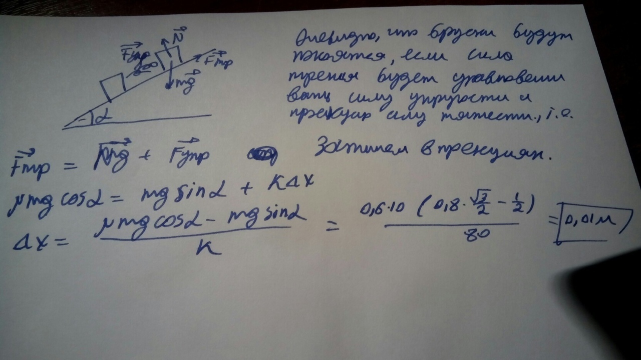 Два одинаковых маленьких бруска массами 0,6 кг каждый соединили друг с другом лёгкой пружиной жёсткости 80Н/м и положили на наклонную плоскость, образующую угол 30 с горизонтом , так, как показано на рисунке. Коэффициент трения между брусками и плоскостью равен 0,8. При какой максимальной деформации дельтаХ пружины эта система может находиться в покое? Считайте, что g=10