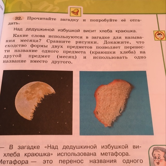 Над(предл.) дедушкиной(прил.) избушкой(сущ.) висит(гл.) краюшка(сущ.). - Повеств.,невоскл.,прост.,распр.,не осл.