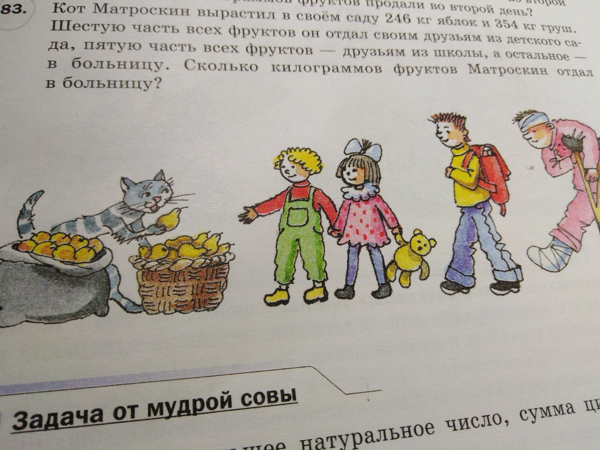 1)246+354=600кг фруктов всего 2)600÷60=100 кг отдал кот в детский сад 3)600÷5=120 кг отдал кот в школу 4)600-(120+100)=380кг Ответ:380кг фруктов кот Матроскин отдал в больницу