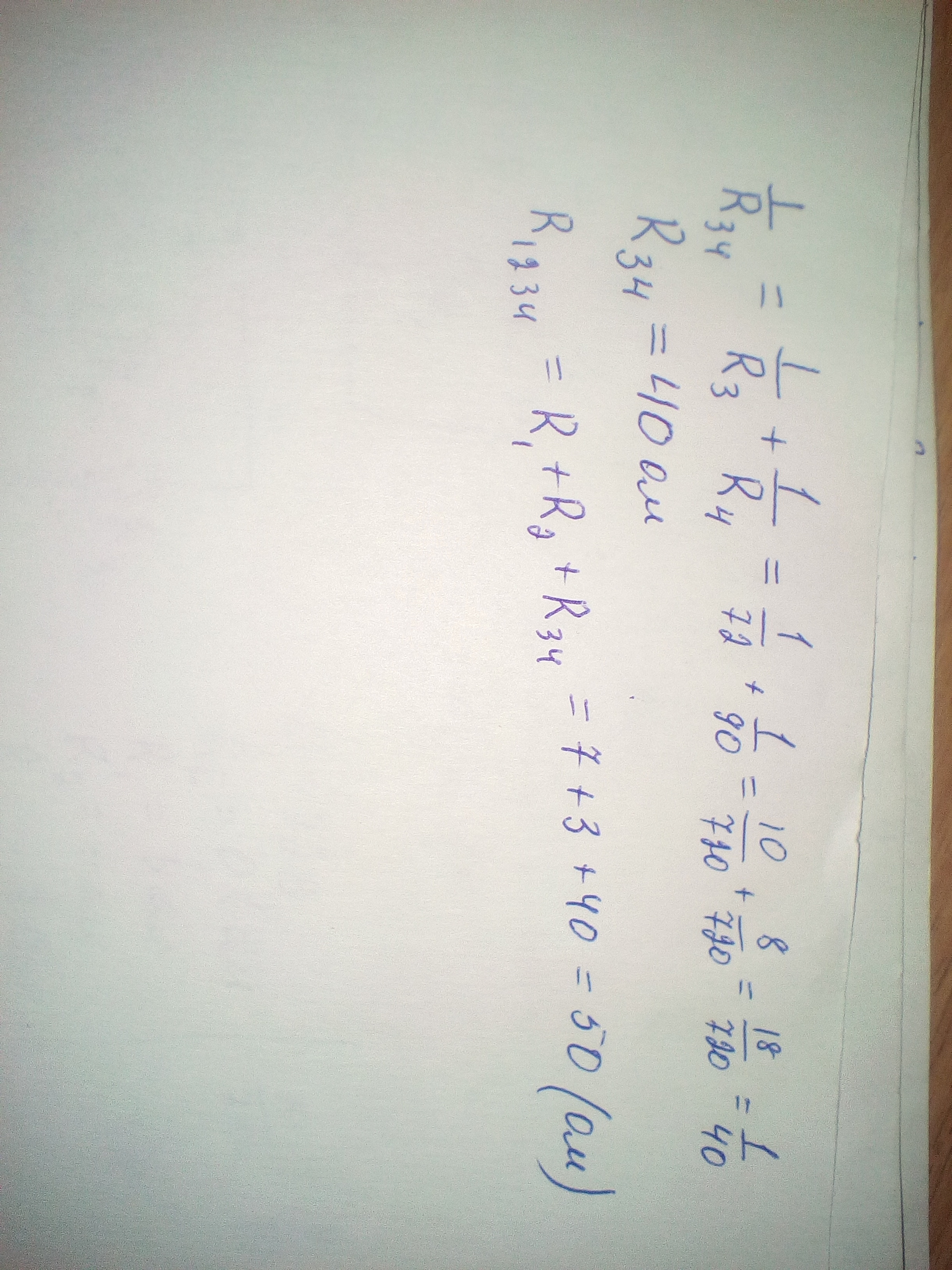 1/R34=1/R3+1/R4=1/72+1/90=1/40 R34=40(Ом) R1234=R1+R2+R34=7+3+40=50(Ом)