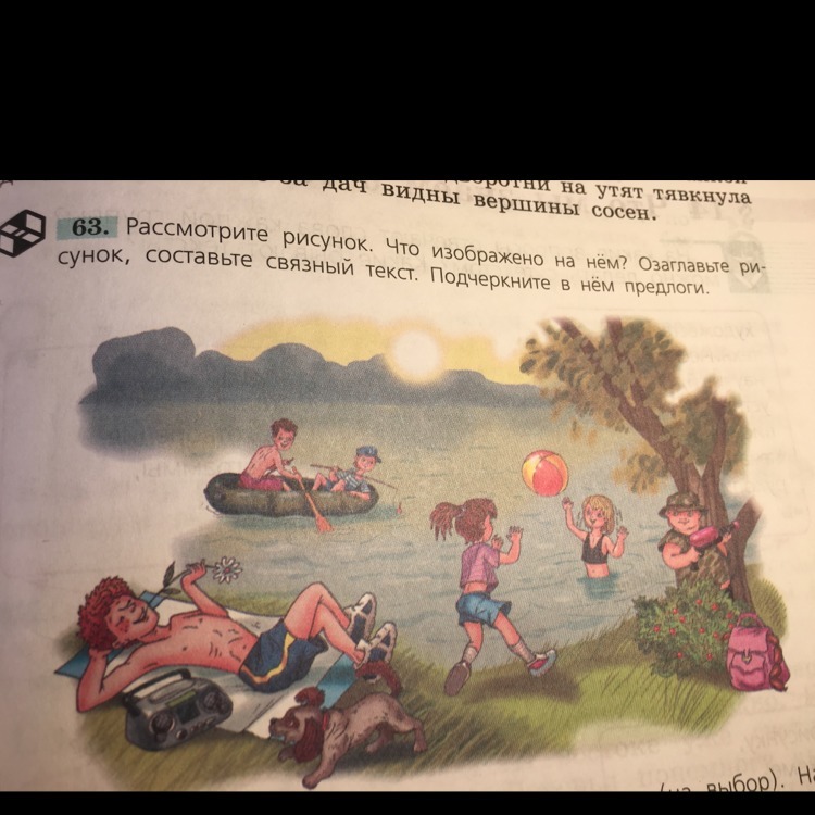 На берегу озера лежит мальчик, а в озере люди плавают на лодке. девочки играют с мячиком, одна в воде,другая на суше. лесник стреляет из водного пистолета.