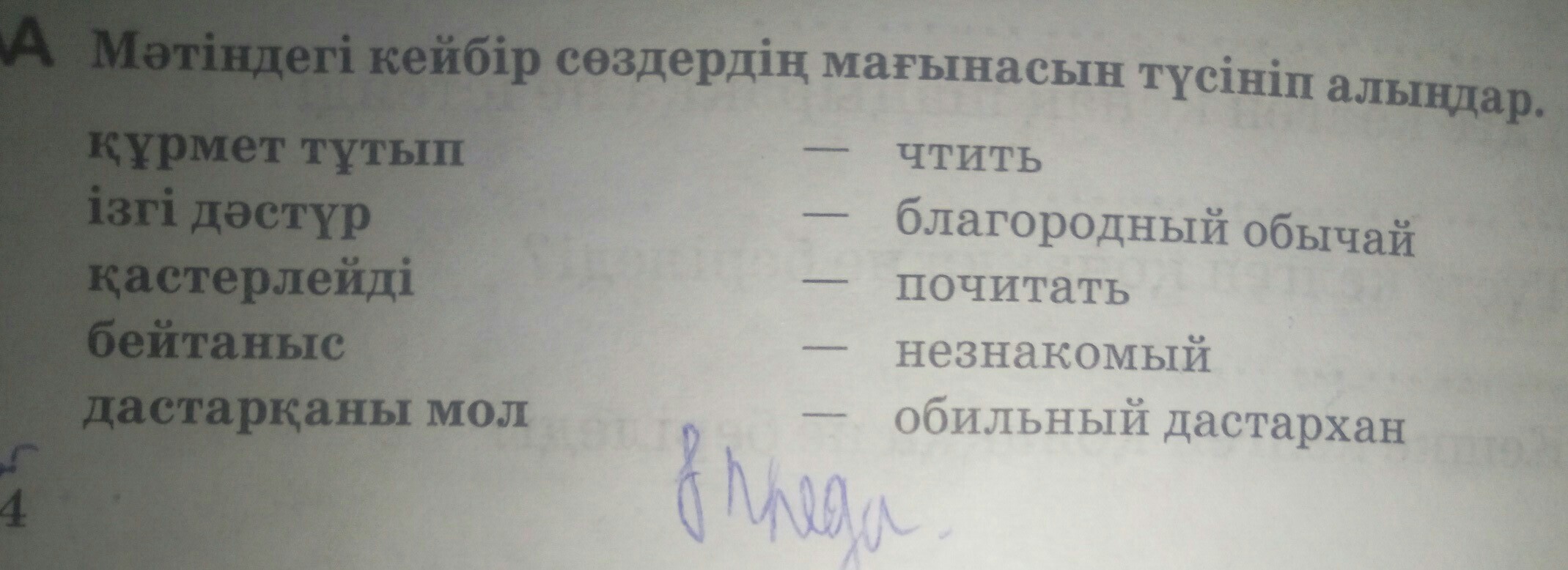 Үлкенді құрмет тұтып, сыйлау керек. Нужно уважать и чтить старших. Бұл ежелден келе жатырған ізгі дәстүр. Это идущие из давних времен благородный обычай. Балалары ата-анасын қастерлейді. Дети почтить своих родителей. Бейтаныс адаммен амандасады. Незнакомым человеком здоровается. Қонақтар үшін қазақ халқының дастарханы мол. У казахского народа для гостей обильный дастархан.