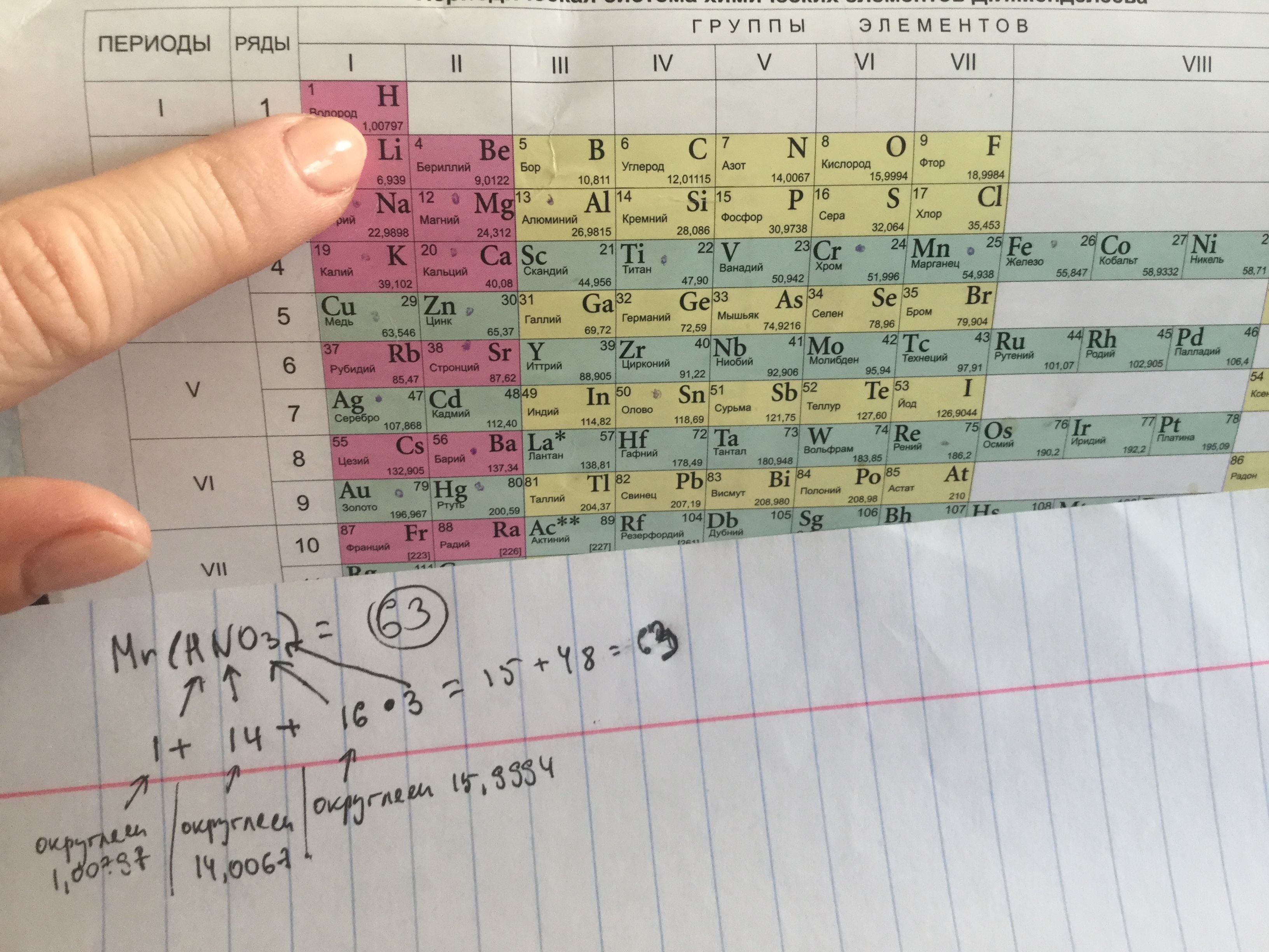 Смотри,вот это страшное большое число под элементами таблицы- это атомная масса.А вот молярная масса(Mr)-это сумма атомных масс всех элементов в соединении и помноженное на число атомов каждого из элементов(число снизу в формуле,в данном случае это 3 у кислорода).Просто берем это страшное большое число,округляем его,и умножаем на количество атомов данного элемента,и так далее плюсуем с другими атомными массами помноженными на число атомов,пока элементы в формуле не закончатся. (Пальчиком я указала страшное большое число) :)