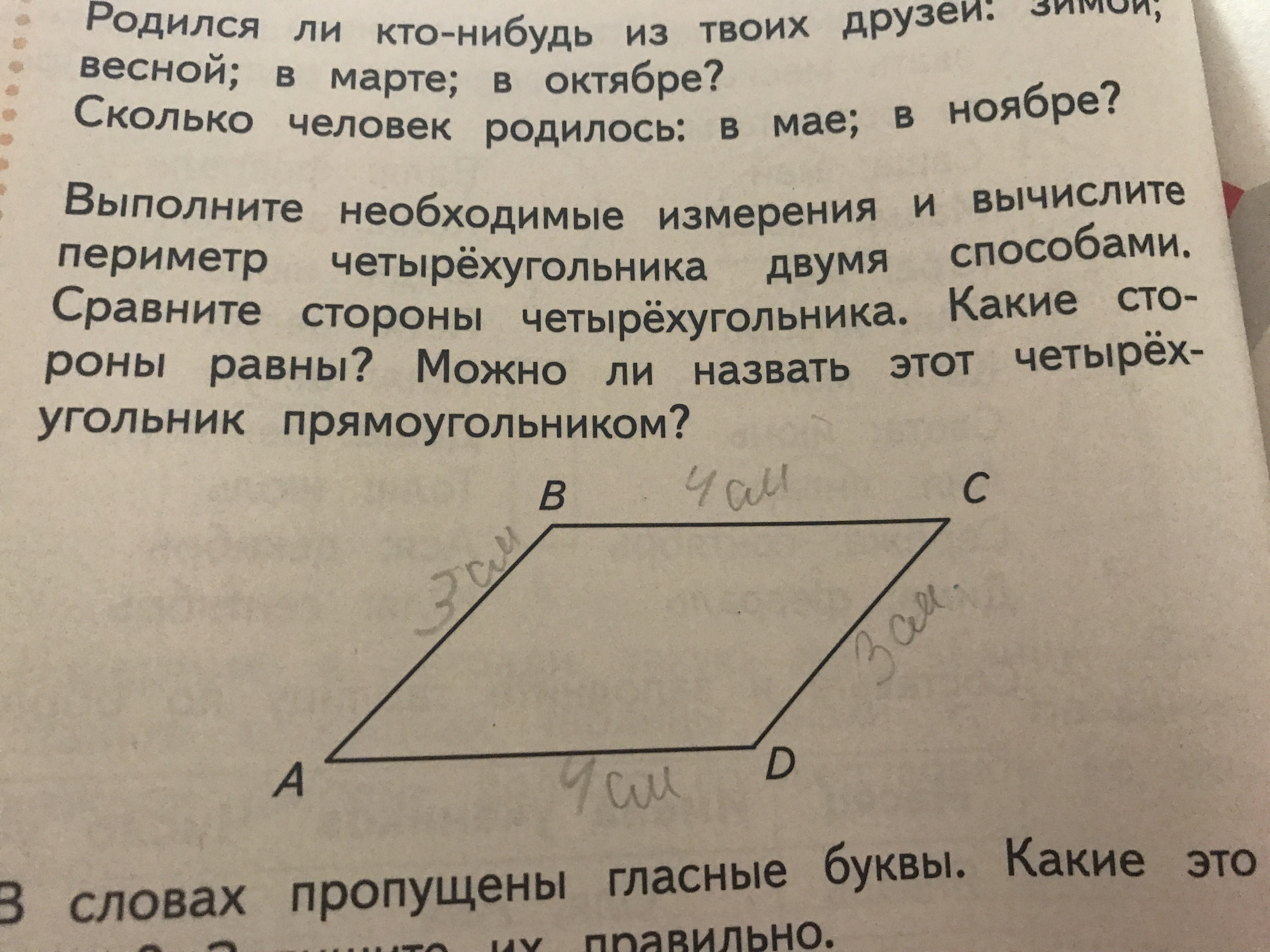 Р=3+4+3+4=14 Р=2×(3+4)=14 Противоположные стороны четырёхугольника равны, т. е. АВ=СD; BC=AD). Четырёхугольник не является параллелограммом, т. к. ни один из его углов не равен 90°.