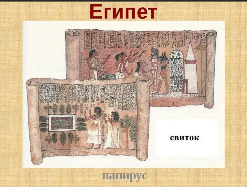 1) Древние египетские книги, сохранившиеся до настоящего времени,— папирусные свитки — представляли собой склейку из листов папируса, свернутую в плотную трубочку.Текст наносили на папирус тонкими палочками красной или черной красками, затем исписанный папирус свертывали на палку и получали готовый свиток.
