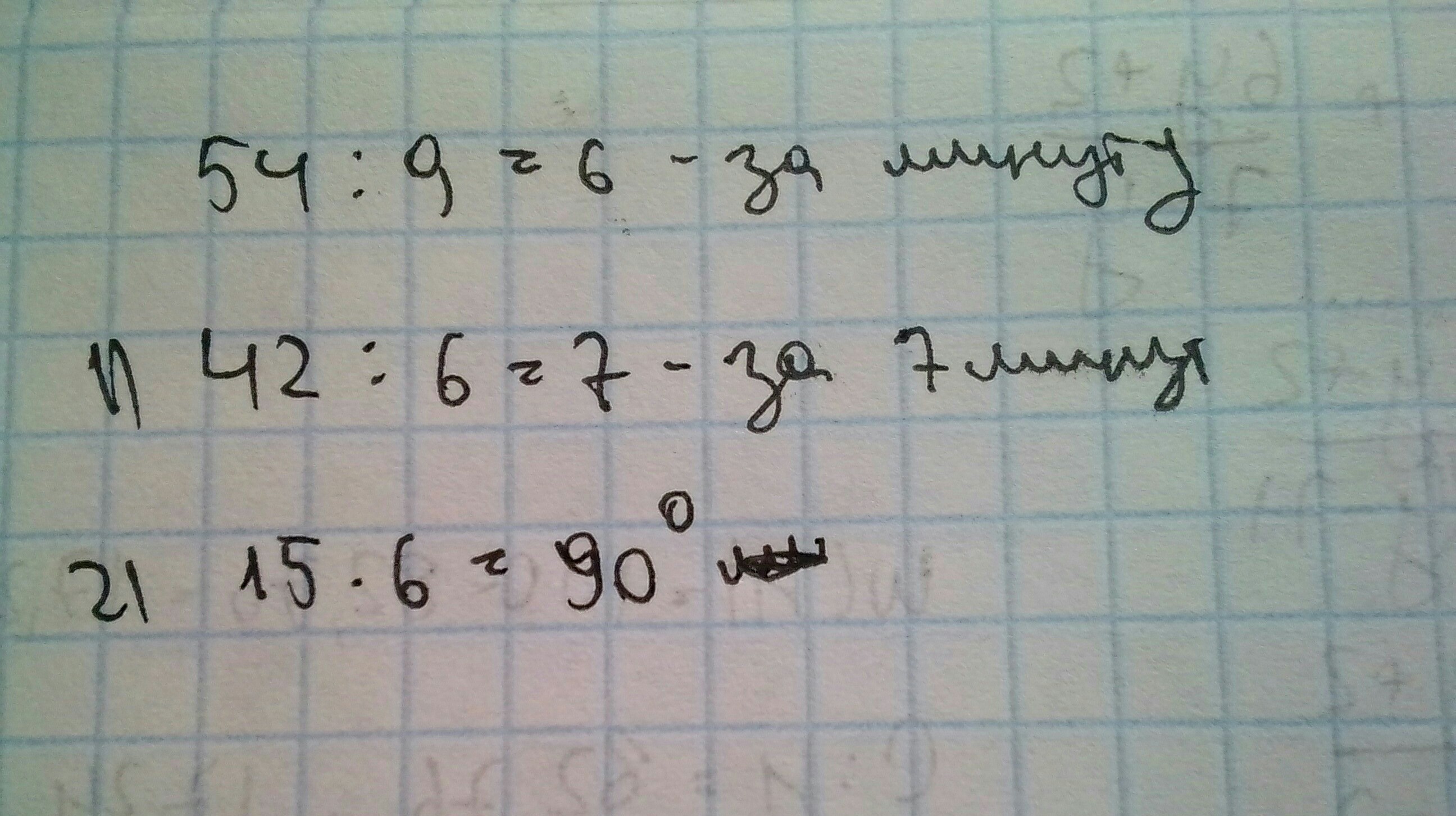 х=42*9/54=7 минут... За одну минуту стрелка поворачивается на 6 градуов. 360гр . это 60 минут.