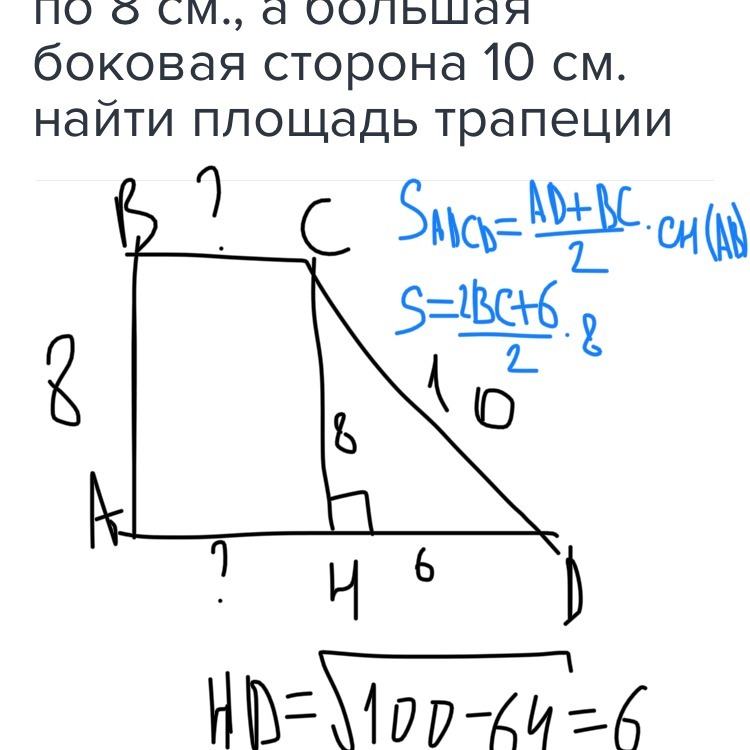 У прямокутной трапеции меньша основание ы меньша боковая сторона по 8 см., а большая боковая сторона 10 см. найти площадь трапеции