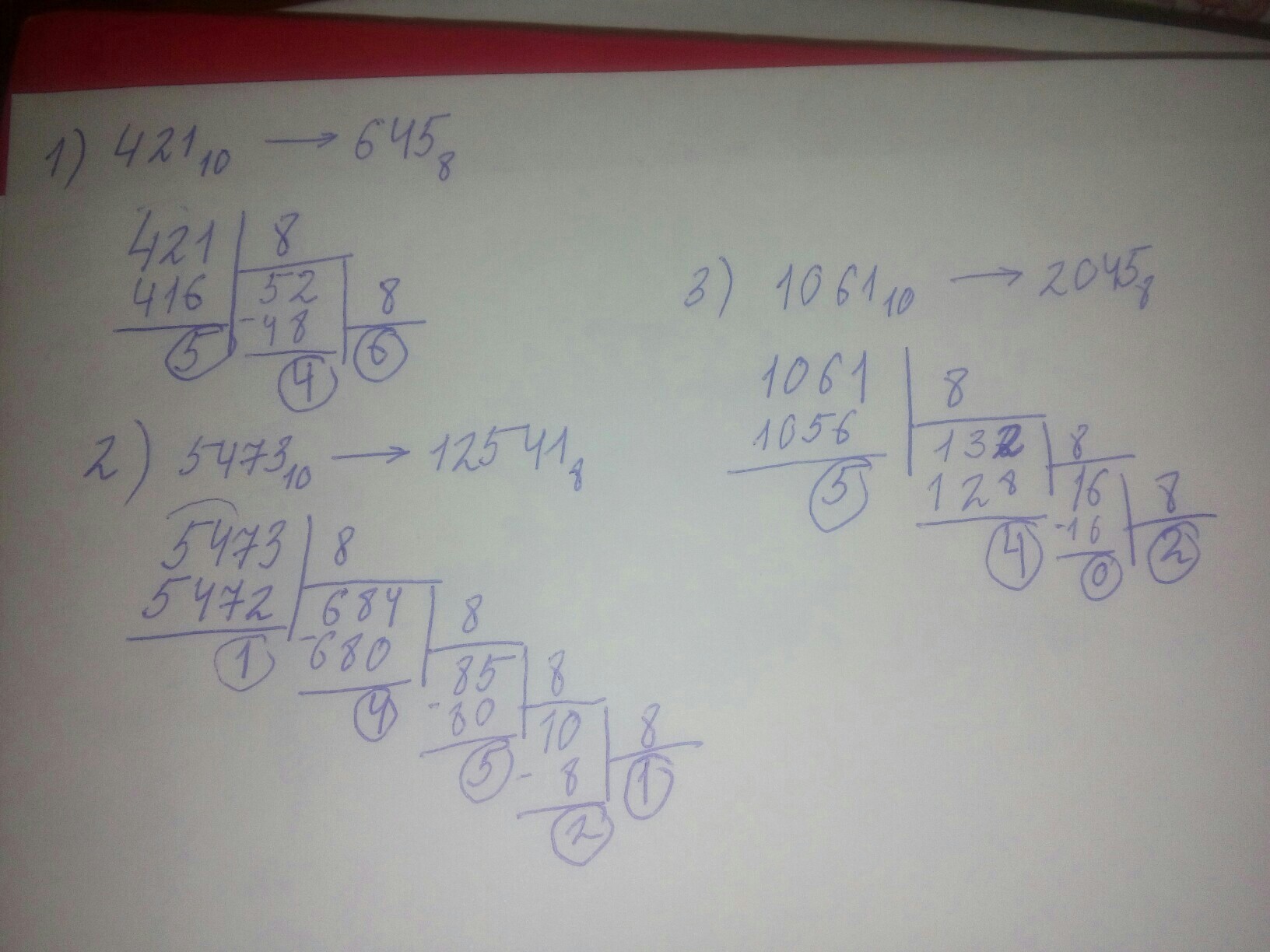 десятичные числа 421, 5473, 1061 перевести в восьмеричную систему полное решение пожалуйста