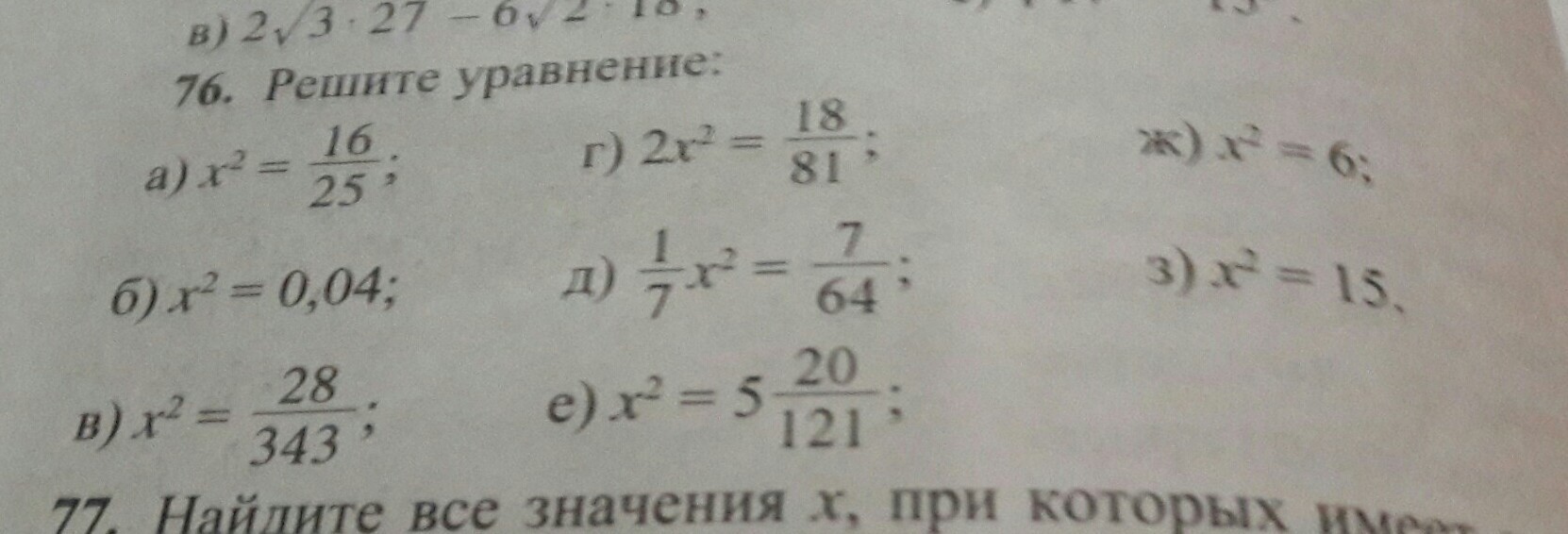 б) х²= 0,04, х= 0,02 ж) х²= 6 и з) х²= 15 не возможно, так как им нельзя сделать в корне,