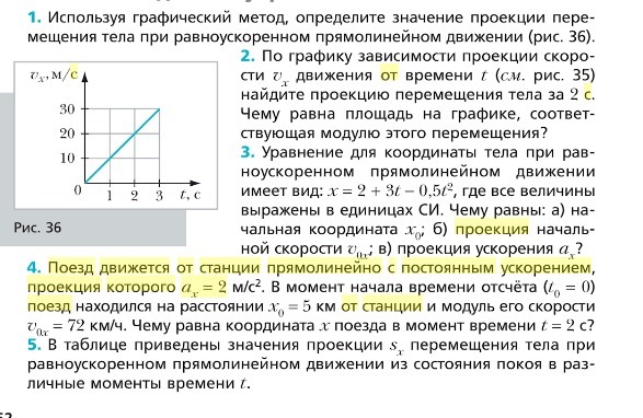 4) Координату Х можно найти по формуле: Х=Хo+Vox*t+aх*t^2/2 где Хо -начальная координата, Vox -начальная скорость тела, ах -проекция ускорения тела на ось ОХ, t - время движения Переведем все в СИ: 5км=5000м 72 км/ч= 72:3.6= 20 м/с Подставив все что имеем в формулу получаем: Х=5000+(20*2)+(2*2^2/2)= 5044 м Ответ: 5044м