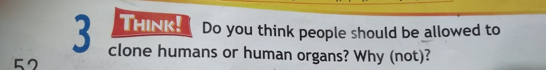 In my opinion you shouldn't clone people and here into the account of their bodies it is necessary to clone to help other people...