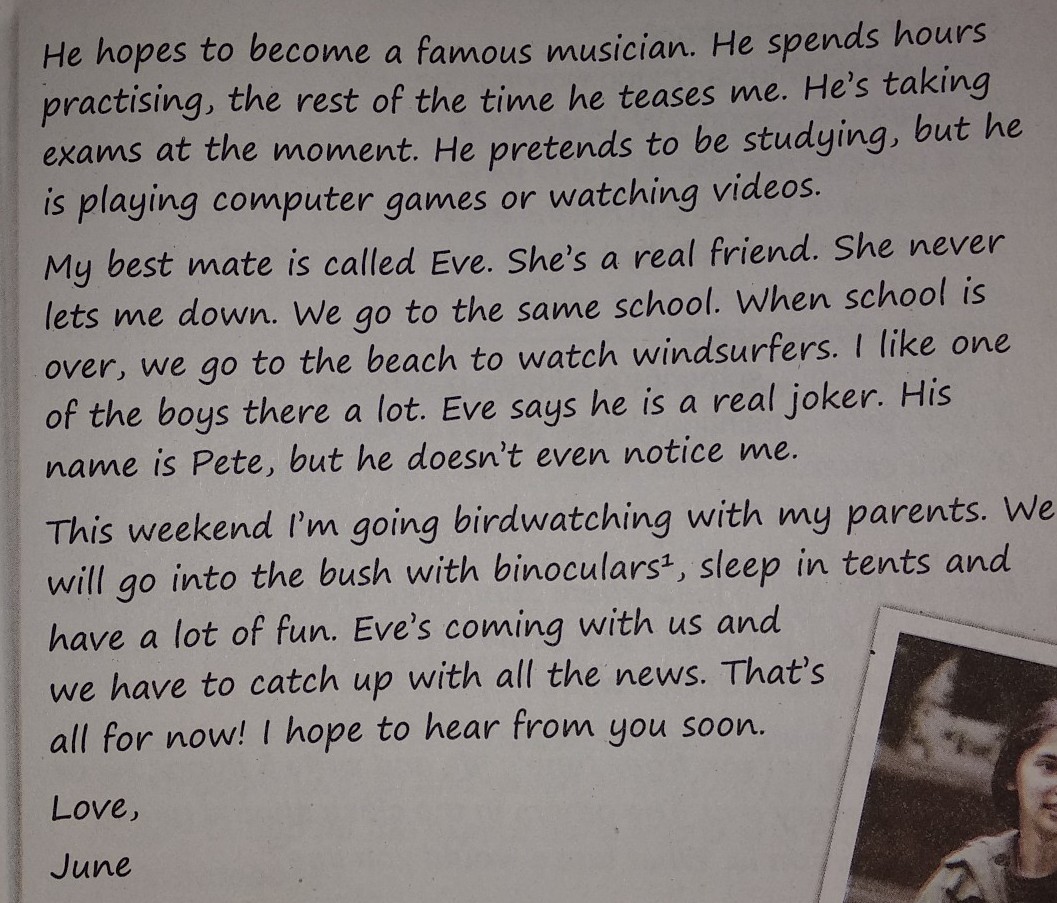 Он надеется стать известным музыкантом. Он практикуется, в остальное время он меня дразнит. Сейчас он на экзаменах. Он притворяется, что учится, но он играет в компьютерные игры или смотрит видео. Мою лучшую подругу зовут Ева. Она настоящий друг. Она никогда меня не подводит. Мы идем в одну школу. Когда школа кончается, мы идем на пляж, чтобы посмотреть на серфинг. Мне очень нравится один из мальчиков. Ева говорит, что он настоящий шутник. Его зовут Пит, но он даже не замечает меня в течение нескольких часов. В эти выходные я буду наблюдать за птицами с моими родителями. Мы отправимся в поход с биноклем, будем спать в палатках и будем веселиться. Ева идет с нами. Вот и все! Надеюсь услышать тебя позже.