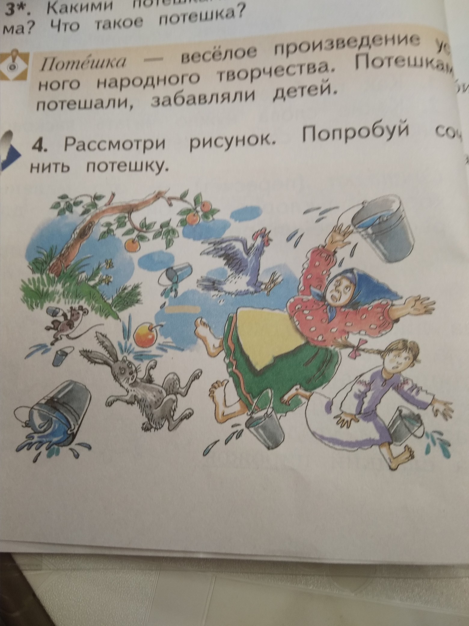 С дочкой вот что сочинили. Шла бабулька за водой,мимо яблоньки пошла.Ой лю ли,ой лю ли внученька за ней пошла. Вышли на полянку,увидали зайку.Мимо мышка пробегала, бабку увидала.Мышка испугалась,бабка растерялась.Ведра уронили,воду всю разлили