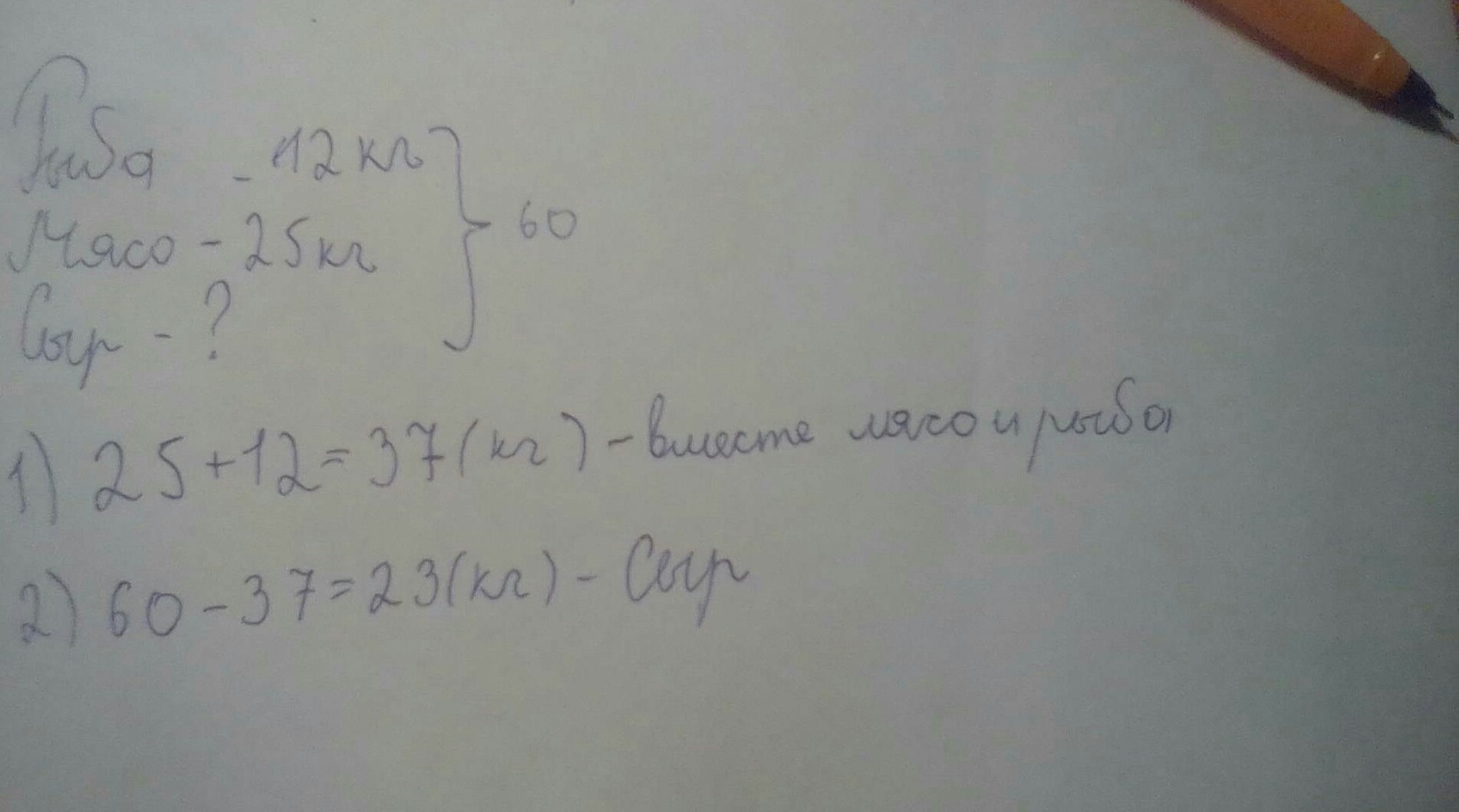 Сыр равен 23 килограмма.Обратная задача где надо найти всего,поэтому 23+12+25