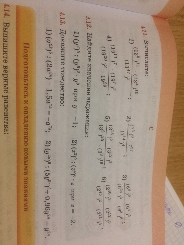 4.11.; ; frac{(13^5)^{11}cdot (13^4)^{10}}{(13^{47})^2}=frac{13^{55}cdot 13^{40}}{13^{94}}=13^{55+40-94}=13^{1}=13\\frac{(7^5)^6cdot 7^{27}}{(7^{14})^4}=frac{7^{30}cdot 7^{27}}{7^{56}}=7^{30+27-56}=7^{1}=7\\frac{(6^8)^9cdot (6^4)^5}{(6^{24})^3cdot (6^3)^6}=frac{6^{72}cdot 6^{20}}{6^{72}cdot 6^{18}}=frac{6^{92}}{6^{90}}=6^2=36\\frac{(19^{11})^7cdot (19^{7})^2}{(19^{20})^3cdot 19^{29}}=frac{19^{77}cdot 19^{14}}{19^{60}cdot 19^{29}}=frac{19^{91}}{19^{89}}=19^2=361