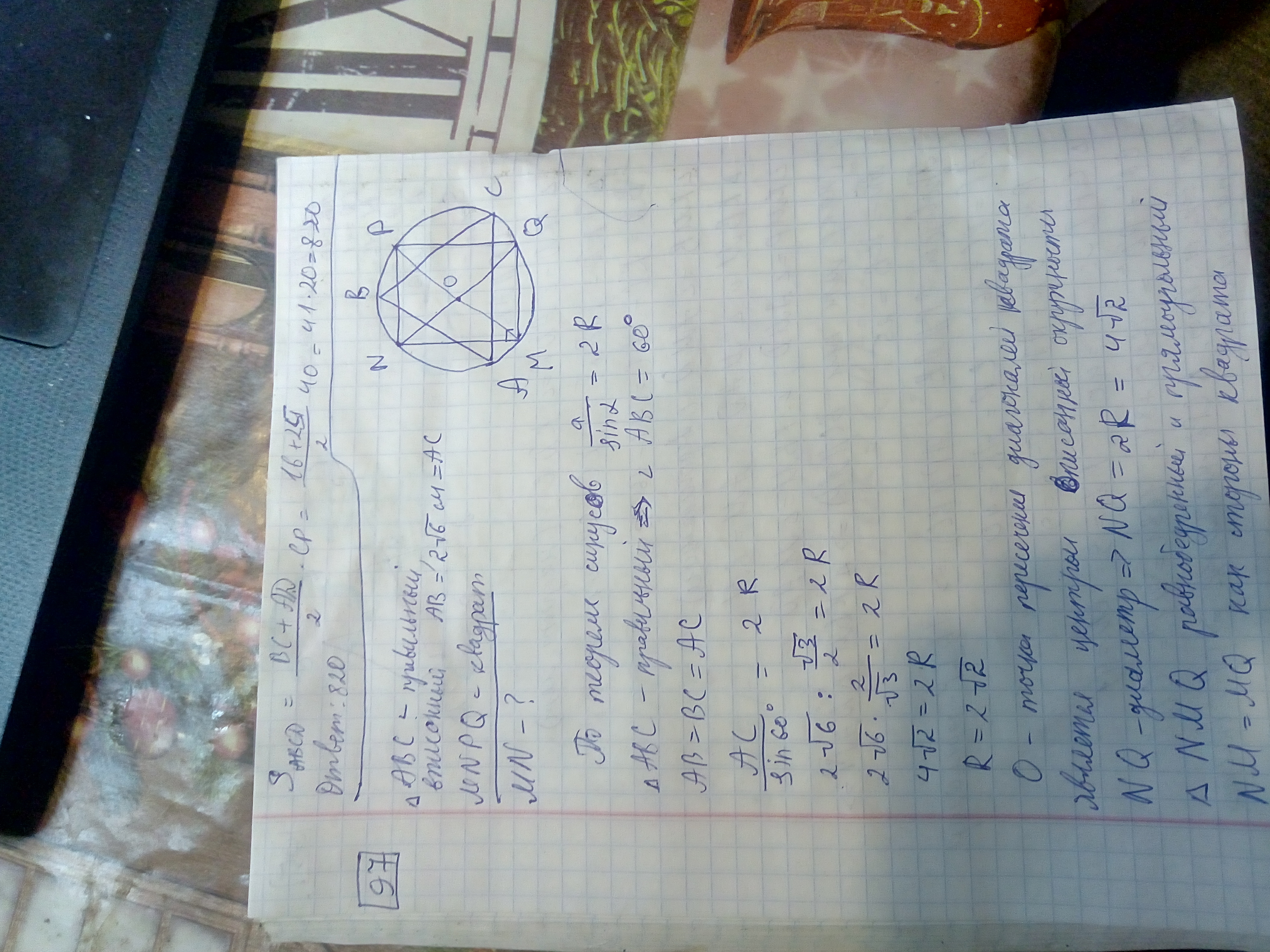 Правильный треугольник со стороной 2 корня из 6 см вписан в окружность.Найдите сторону вписанного в эту окружность квадрата.Помогите пожалуйста, очень надо!!