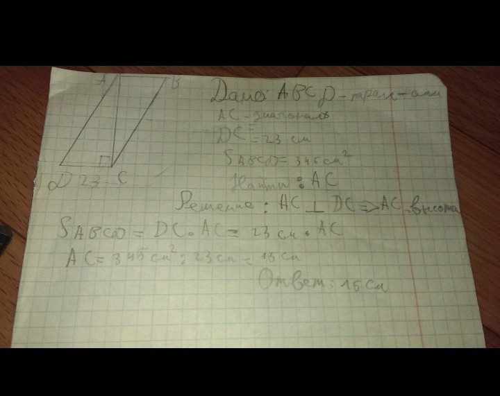 Диагональ паралелонрамма перпендикулярно к стороне 23 см.Найти эту Диагональ,Если Sпарал.=345 см в квадрате