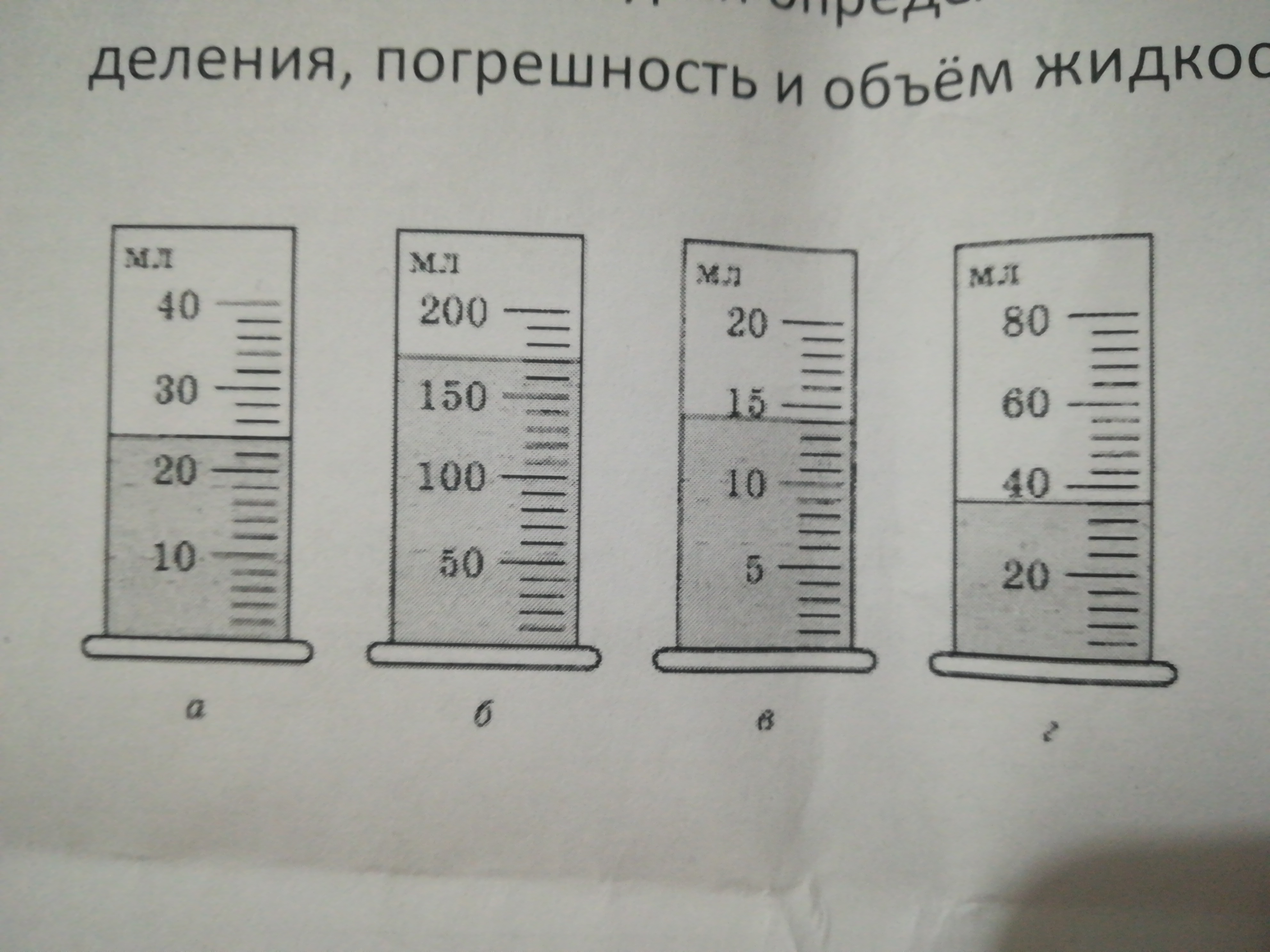 Для каждой мензурки определите предел измерений, цену деления, погрешность и объем жидкости налитой в мензурке