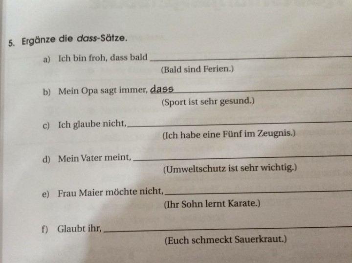 1)...., dass bald Ferien sind. 2)......, dass Sport sehr gesund ist. 3)......, dass ich eine Fünf im Zeugnis habe. 4)........, dass Umweltschutz sehr wichtig ist. 5)....., dass ihr Sohn Karate lernt. 6)....., dass Sauerkraut euch schmeckt.