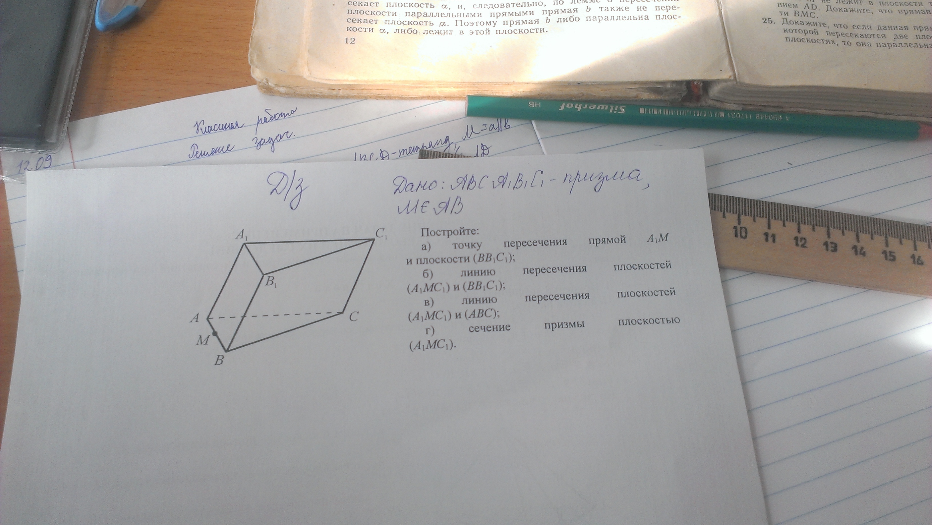 а) А1М может пересечься только с прямой, лежащей в этой же плоскости... это В1В (продолжаем В1В вниз, продолжаем А1М вниз) обозначим эту точку Т б) это ТС1 в) обозначим точку пересечения прямых ТС1 и ВС как Р; это МР г) это А1МРС1 (трапеция, А1С1 || МР)