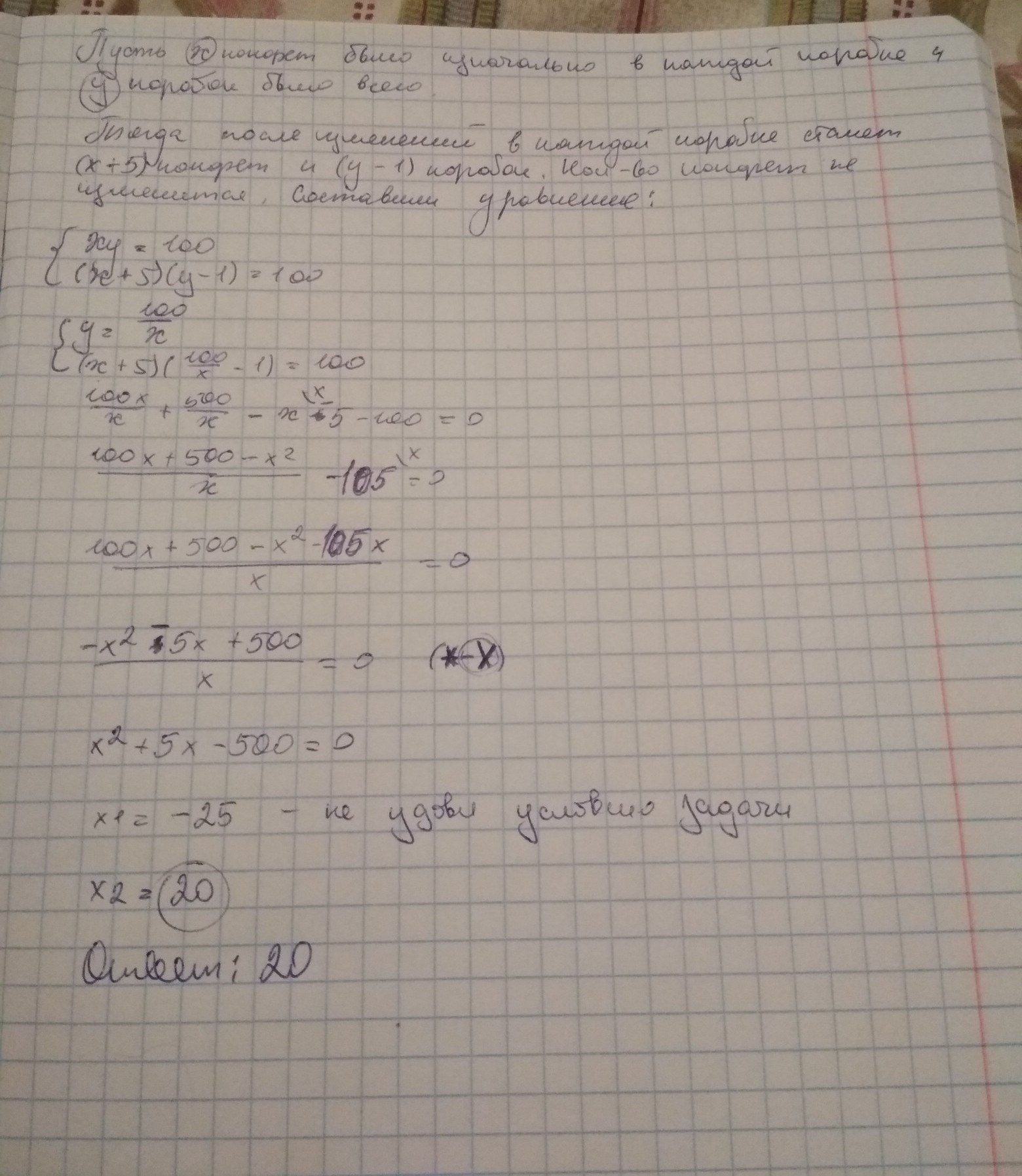 100 конфет разложили в коробки. Если в каждую коробку положить на пять конфет больше , то коробок потребуется на одну меньше , чем было запланировано первоначально. Сколько конфет планировали положить в каждую коробку ? Ответ:20 . Нужно решение