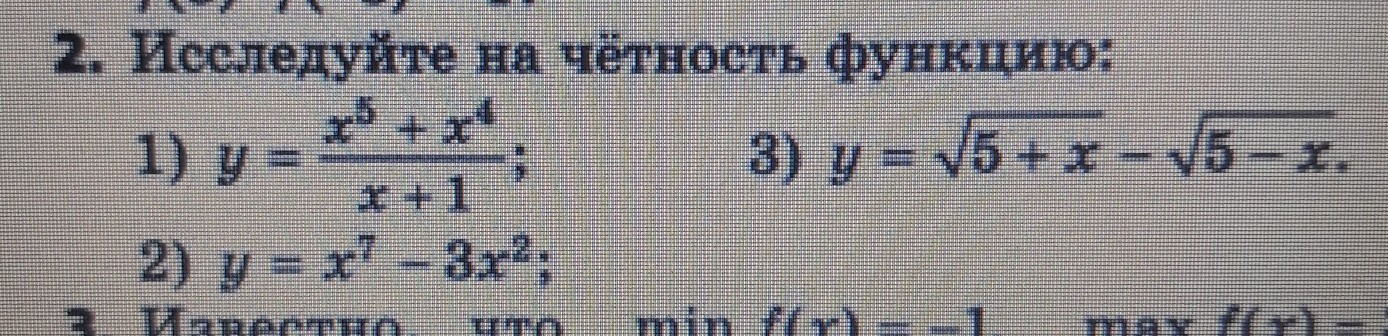 3. Возьмем х и -х/ f(x) = √(5+x)- √(5-x); f(-x)=√(5-x)-√(5+x) = f(x). Это четная функция.